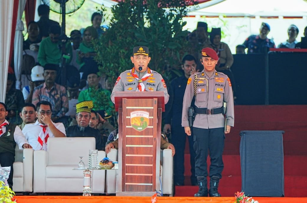 Kapolri Jenderal Listyo Sigit Prabowo menjadi Inspektur upacara pembukaan Jambore Karhutla 2025 di Bumi Perkemahan Tahura Sultan Syarif Hasyim, Kabupaten Siak, Jumat (25/4/2025).