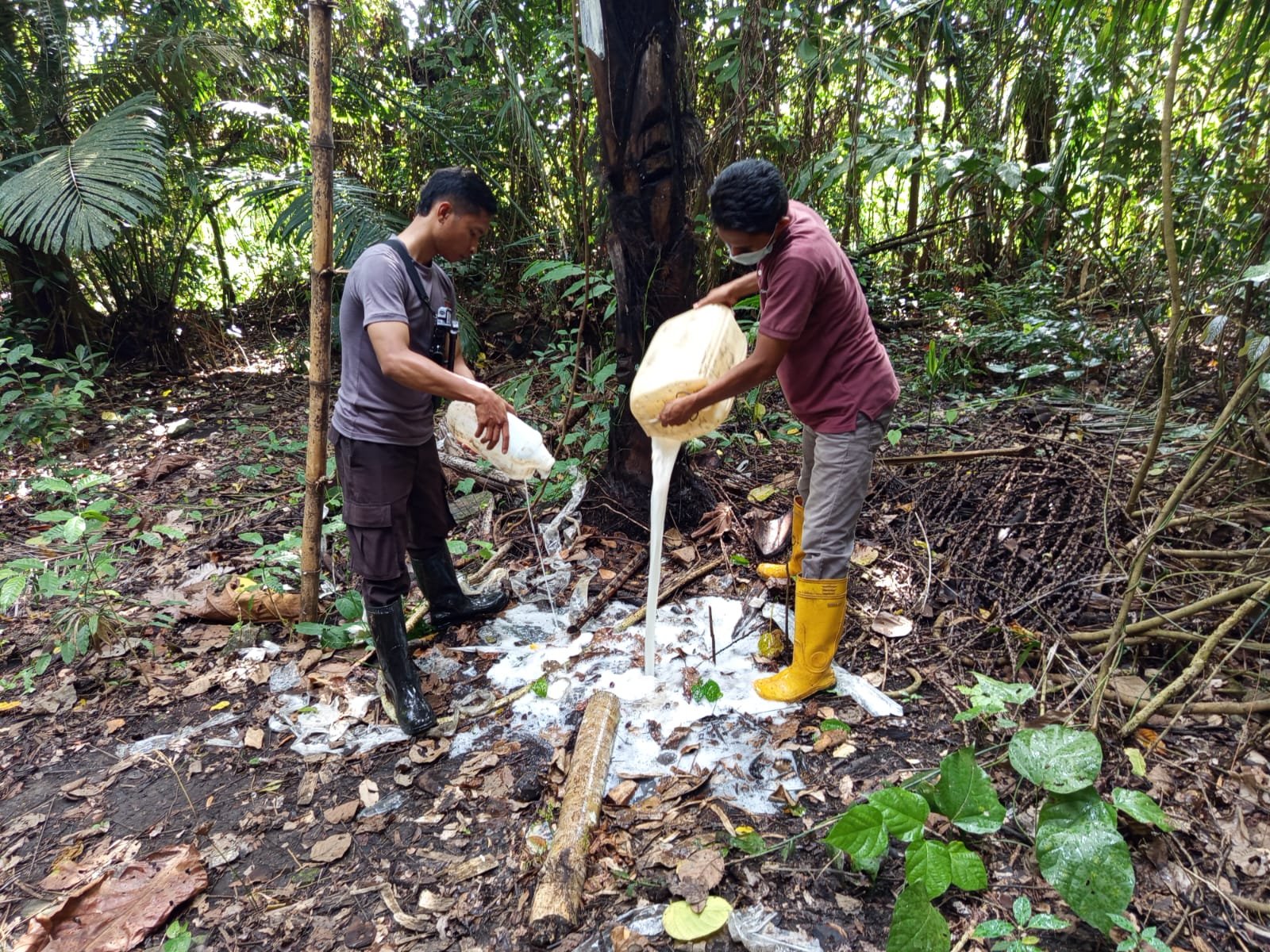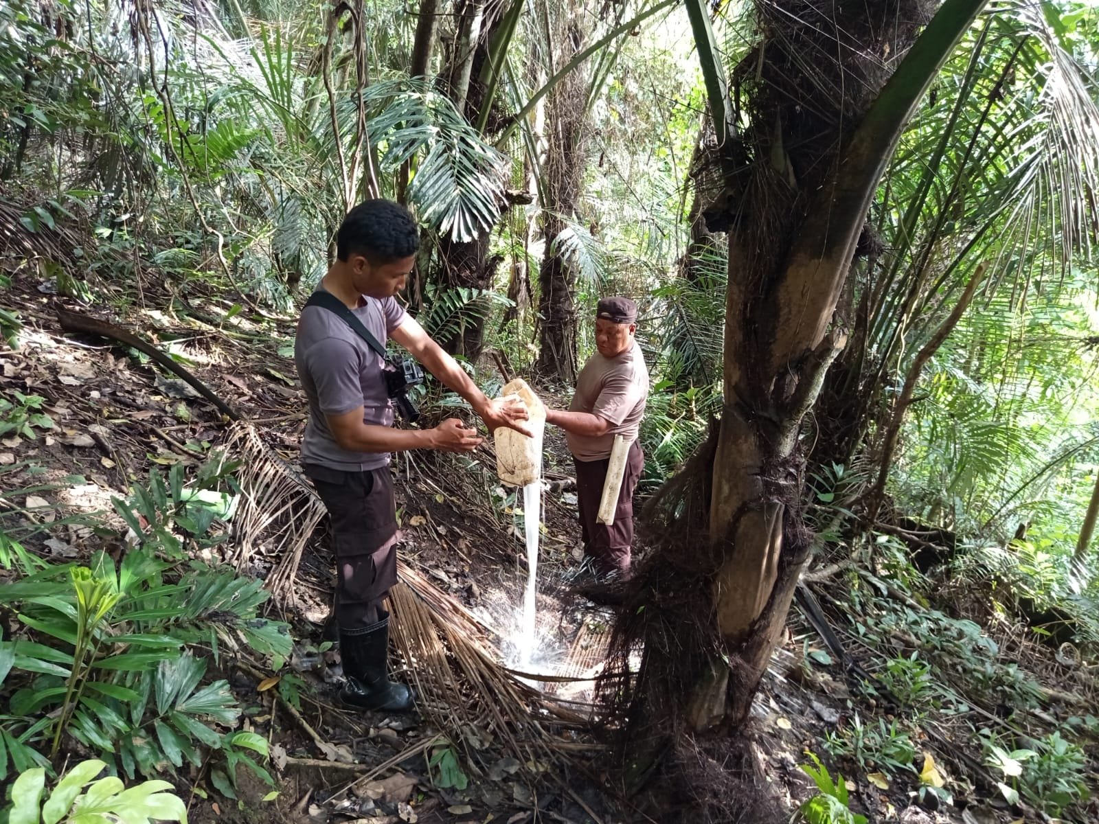 Di lokasi, tim menemukan sejumlah barang bukti, di antaranya bahan saguer yang masih tergantung di pohon aren, serta beberapa jerigen berisi bahan baku. Total bahan baku yang berhasil diamankan mencapai 600 liter saguer, ditambah satu buah bepak (alat penyulingan), serta miras cap tikus hasil olahan sebanyak 5 liter.