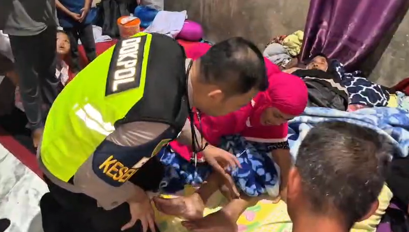 Usai penyerahan bantuan, tim medis Polri melaksanakan pelayanan kesehatan di posko pengungsian. Warga tampak antusias memanfaatkan layanan tersebut dengan memeriksakan kondisi kesehatan, berkonsultasi langsung dengan dokter kepolisian, serta menerima obat-obatan dan vitamin sesuai kebutuhan secara gratis.