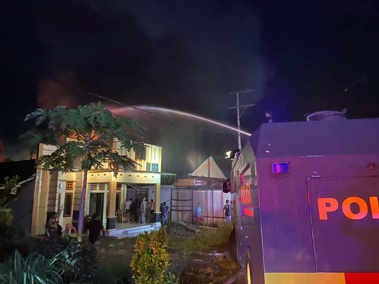 Setibanya di lokasi, personel Polri bersama warga setempat bahu-membahu berusaha memadamkan api agar tidak merembet ke rumah lain di sekitar.