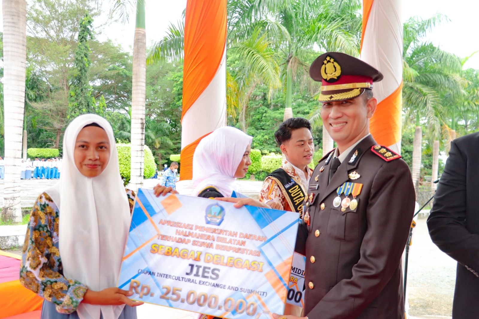 Dalam kesempatan tersebut, Kapolres Halsel AKBP Hendra Gunawan turut berkesempatan menyerahkan penghargaan secara langsung kepada salah satu siswa berprestasi, sebagai wujud dukungan Polri terhadap kemajuan dan prestasi generasi penerus bangsa.