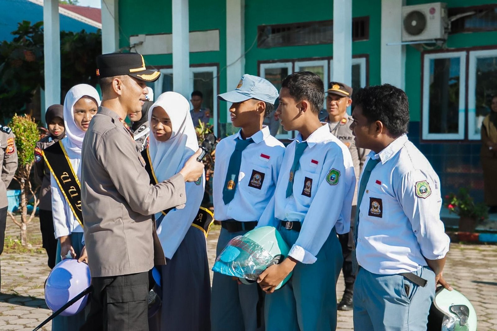 Dalam amanatnya, Kapolres Halsel menyampaikan sejumlah pesan penting kepada para siswa. Ia menekankan pentingnya menjaga sikap dan perilaku di lingkungan sekolah, khususnya dengan menghindari tindakan bullying atau perundungan terhadap sesama teman. Selain itu, Kapolres juga mengingatkan agar pelajar selalu menggunakan helm saat berkendara serta tidak mengemudikan kendaraan bermotor jika belum memiliki SIM atau masih di bawah umur.