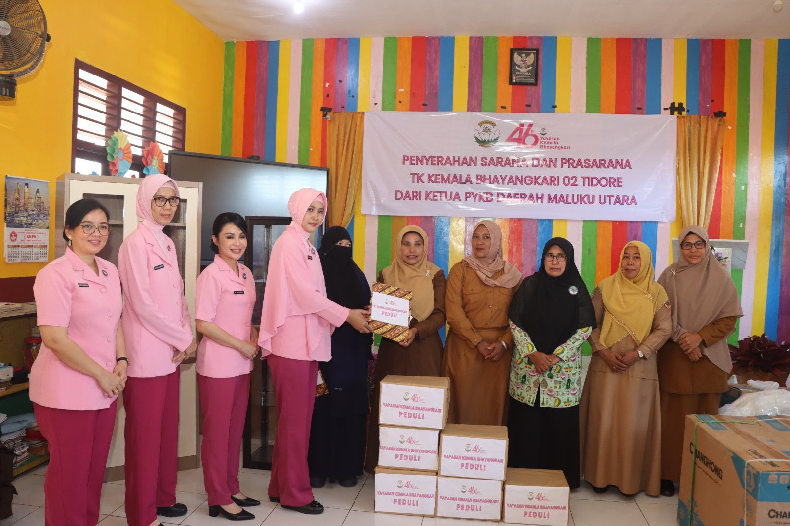 Ketua Pengurus Yayasan Kemala Bhayangkari (PYKB) Daerah Maluku Utara, Ny. Sari Waris Agono, didampingi oleh Ketua Pengurus Yayasan Kemala Bhayangkari (PYKB) Cabang Kota Tidore, Ny. Deby Ampi, melaksanakan kunjungan kerja sekaligus penyerahan bantuan di TK Kemala Bhayangkari 02 Tidore pada Senin, (27/4).