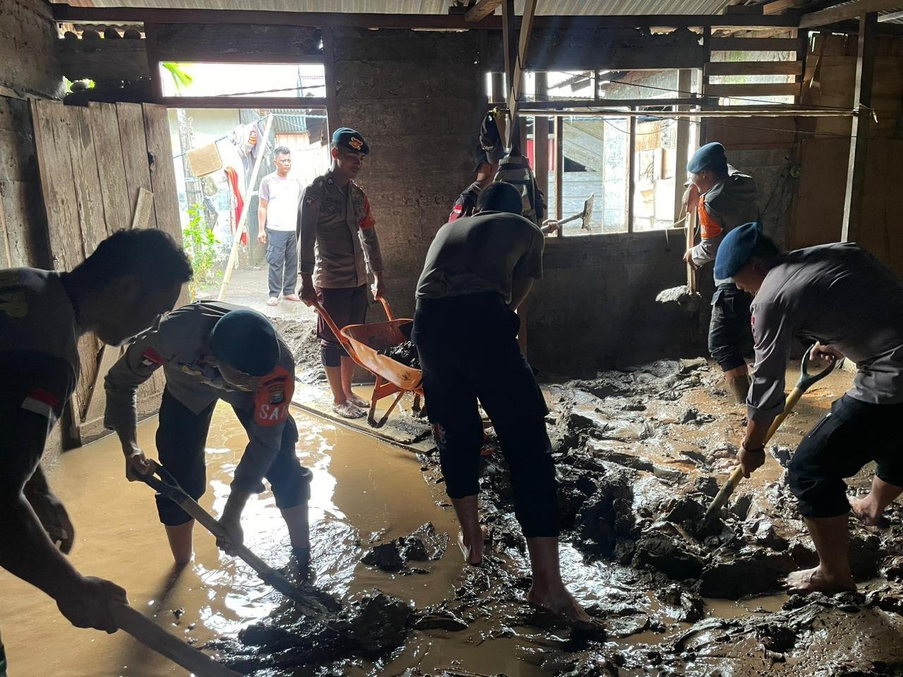 Personel Brimob bersama unsur TNI, BPBD, pemerintah desa, dan masyarakat bahu-membahu membersihkan lingkungan agar aktivitas warga dapat kembali berjalan normal. Selain pembersihan, kegiatan ini juga bertujuan mencegah potensi penyakit serta memastikan lingkungan tetap aman dan sehat pascabanjir.