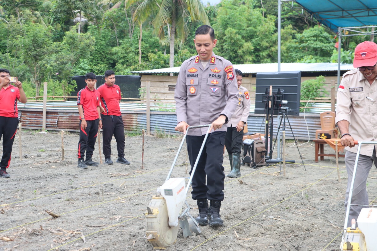 Kapolres Halmahera Selatan, AKBP Hendra Gunawan, S.H., S.I.K., M.M., didampingi Wakapolres Halsel, Kompol Iksan Prananto., S.I.K., M.H., beserta Pejabat Utama Polres Halsel dan Personil Polres Halsel ikut terlibat langsung dalam pelaksanaan Penanaman Jagung.