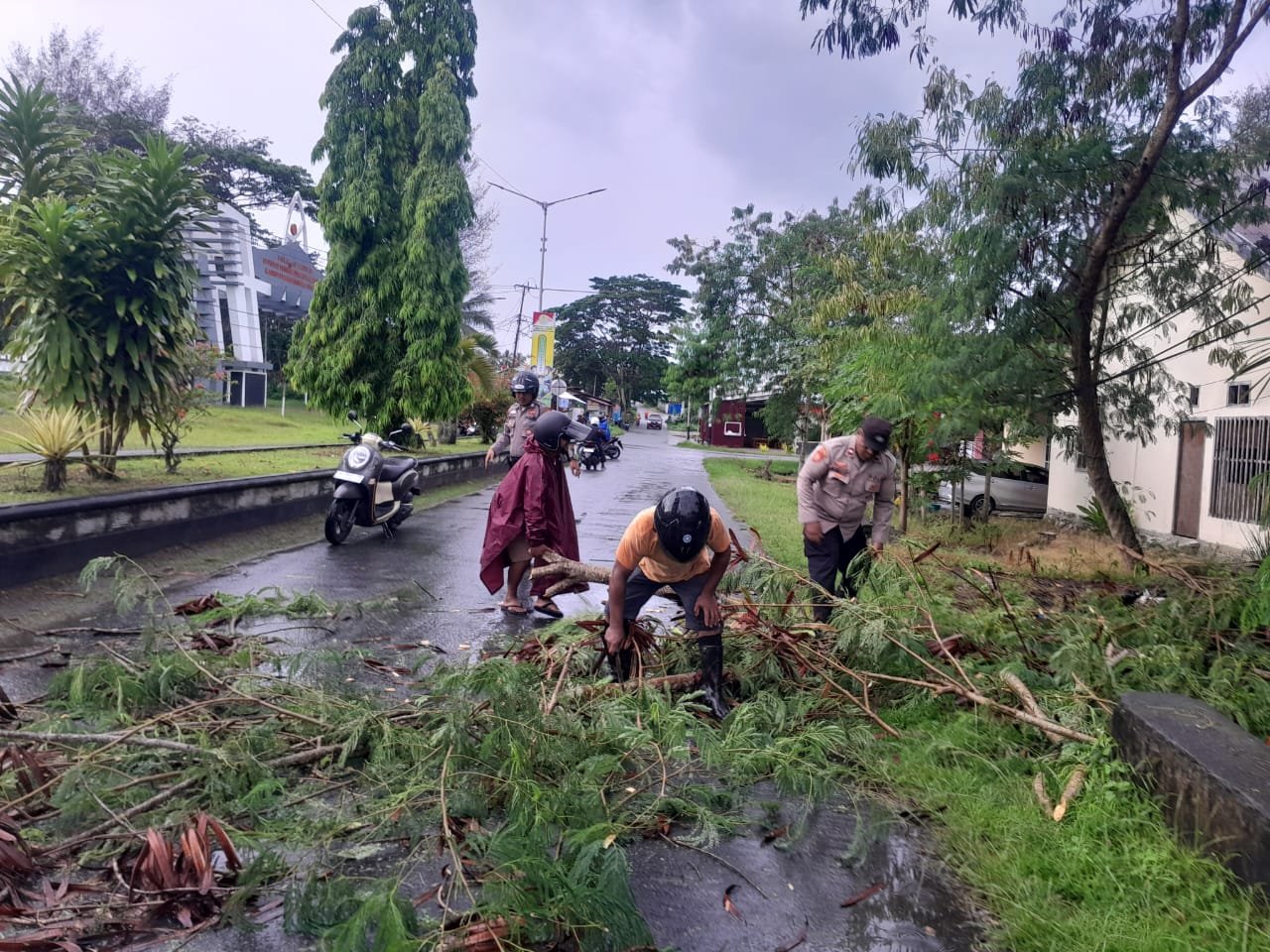 Pohon tersebut diketahui tumbang akibat hembusan angin kencang yang terjadi secara tiba-tiba pada pagi hari dan menimbulkan potensi bahaya bagi pengguna jalan. Melihat kondisi itu, beberapa personel Polres Halsel yang kebetulan melintas langsung menghentikan kendaraan dan turun membantu membersihkan batang serta ranting pohon yang berserakan.