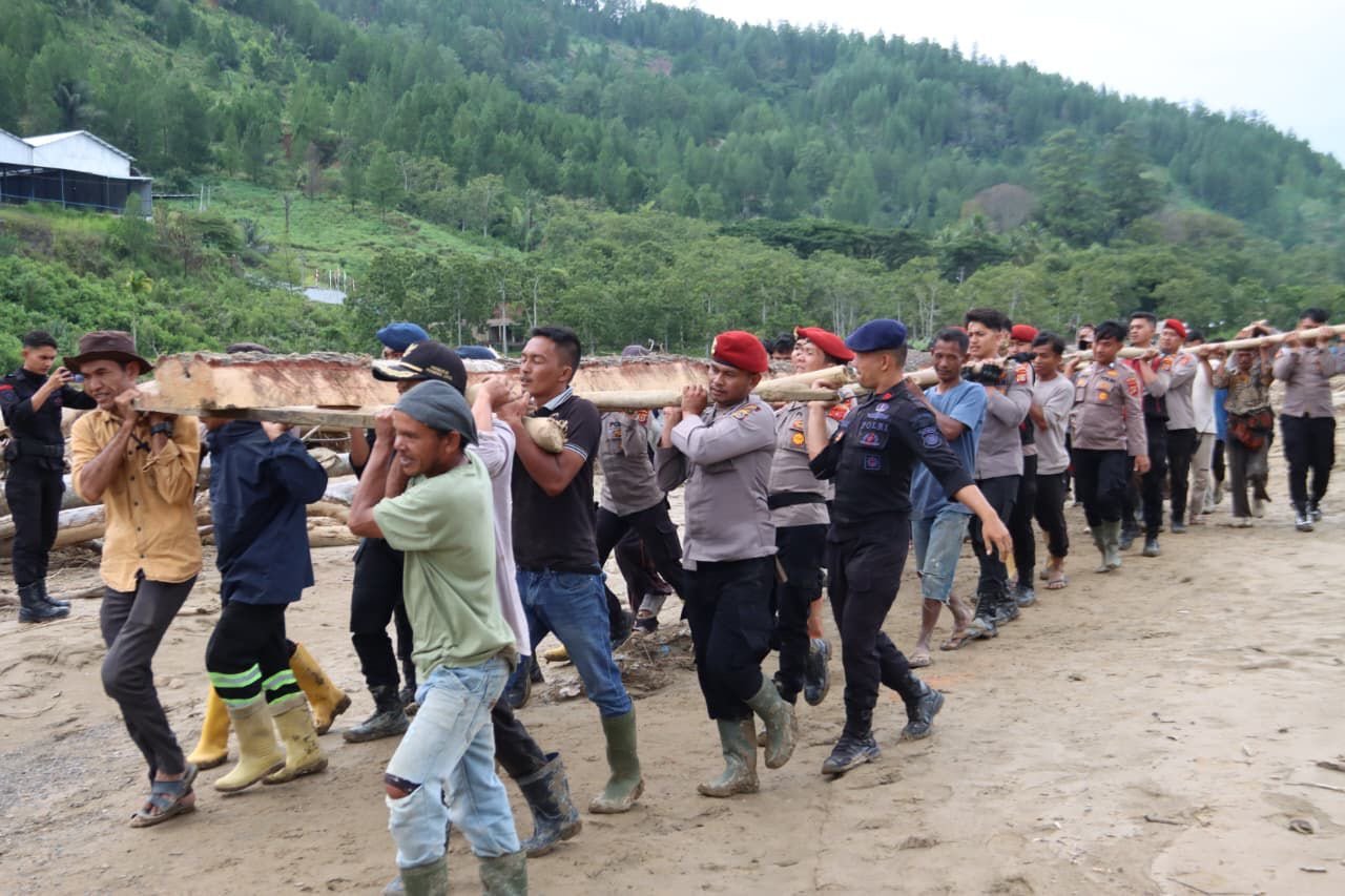 “Personel Polres Gayo Lues, Brimob dan Polsek bersama masyarakat bahu-membahu menyiapkan jembatan darurat dengan memanfaatkan gelondongan kayu bekas banjir bandang. Langkah ini dilakukan agar aktivitas masyarakat dapat kembali berjalan, terutama untuk kebutuhan sehari-hari,” ujar IPTU Muhamad Abidinsyah.