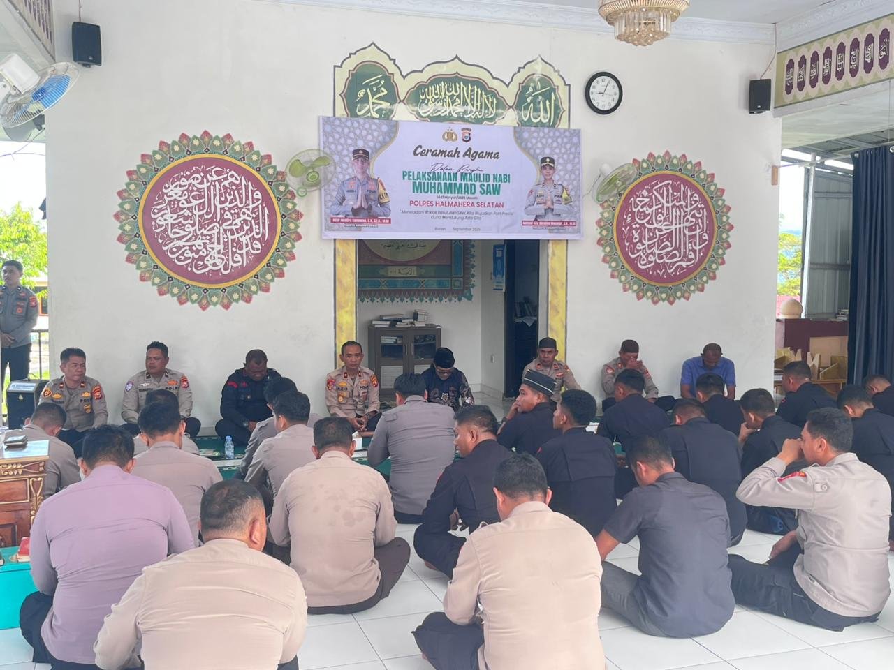 Humas Polres Halsel – Dalam rangka memperingati Maulid Nabi Muhammad SAW, Polres Halmahera Selatan menyelenggarakan kegiatan ceramah agama yang berlangsung di Masjid Al-Kautsar Polres Halsel. Kegiatan keagamaan ini diikuti oleh seluruh personel Polres Halmahera Selatan bersama anggota Kompi 2 Batalyon C Satbrimob Polda Maluku Utara.Kamis (04/09/25)