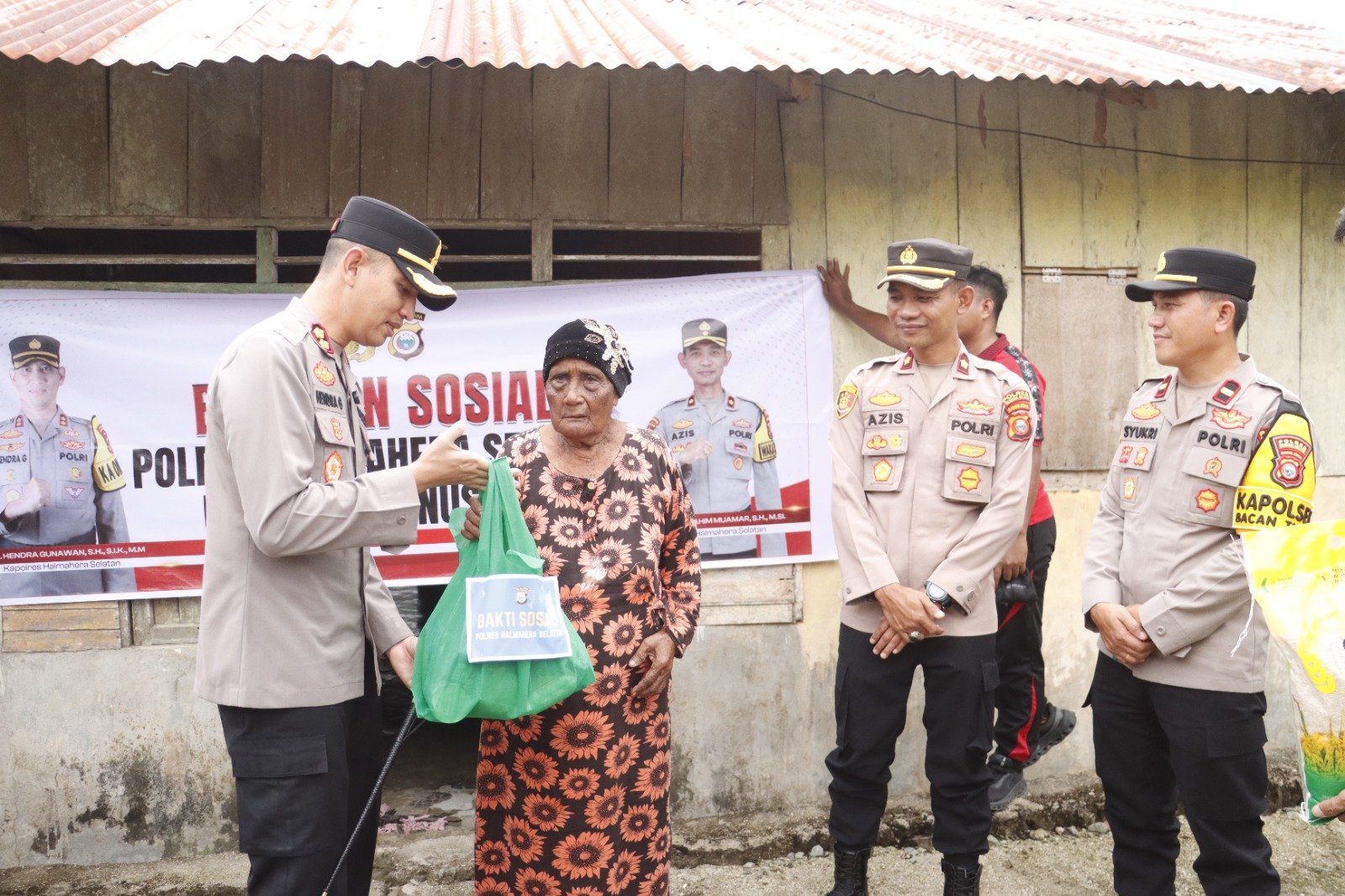 Dalam kegiatan tersebut, Kapolres Halmahera Selatan AKBP Hendra Gunawan, S.H., S.I.K., M.M. bersama Wakapolres Halsel Kompol Azis Ibrahim Muamar, S.H., M.Si. turun langsung menyerahkan bantuan sosial berupa paket sembako kepada warga. Turut hadir pula para Pejabat Utama (PJU) Polres Halsel, para perwira, serta Kapolsek Bacan Timur yang mendampingi jalannya penyaluran bantuan.