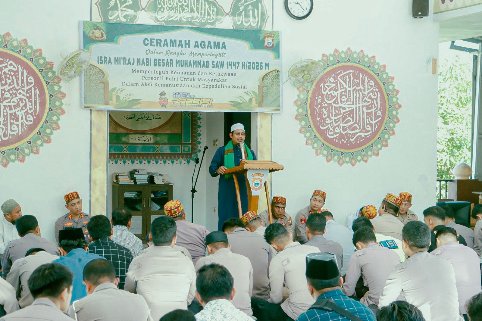 Peringatan Isra Mi’raj ini juga menghadirkan penceramah Ustadz Abdul Haris Krois, M.A., yang memberikan tausiah keagamaan kepada seluruh personel dan Bhayangkari. Dalam tausiahnya, Ustadz Abdul Haris Krois mengajak seluruh hadirin untuk meneladani nilai-nilai spiritual Isra Mi’raj, khususnya dalam meningkatkan keimanan, ketakwaan, serta kedisiplinan dalam menjalankan tugas dan tanggung jawab sehari-hari.