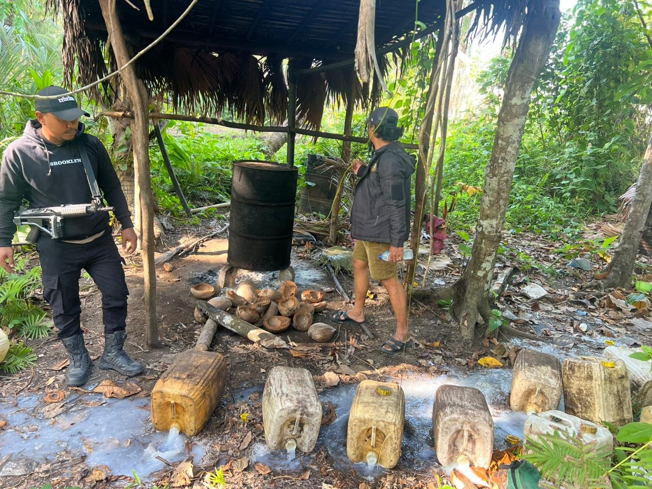 Dari hasil kegiatan tersebut, petugas berhasil menemukan dua lokasi tempat penyulingan miras tradisional jenis Cap Tikus yang berada di kawasan Hutan Aren, Desa Kota Low, Kecamatan Gane Timur. Pada TKP pertama, petugas menemukan satu drum penyulingan dengan bahan baku sebanyak 100 liter, serta enam jerigen berukuran 25 liter berisi bahan mentah dengan total 150 liter.