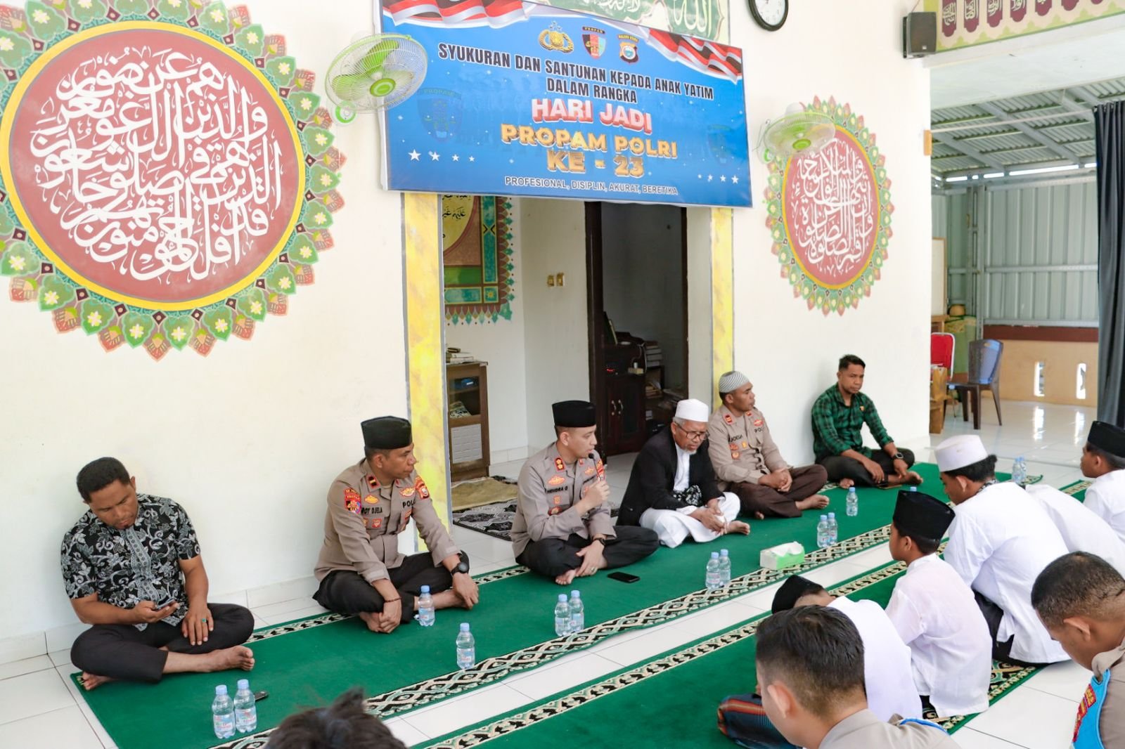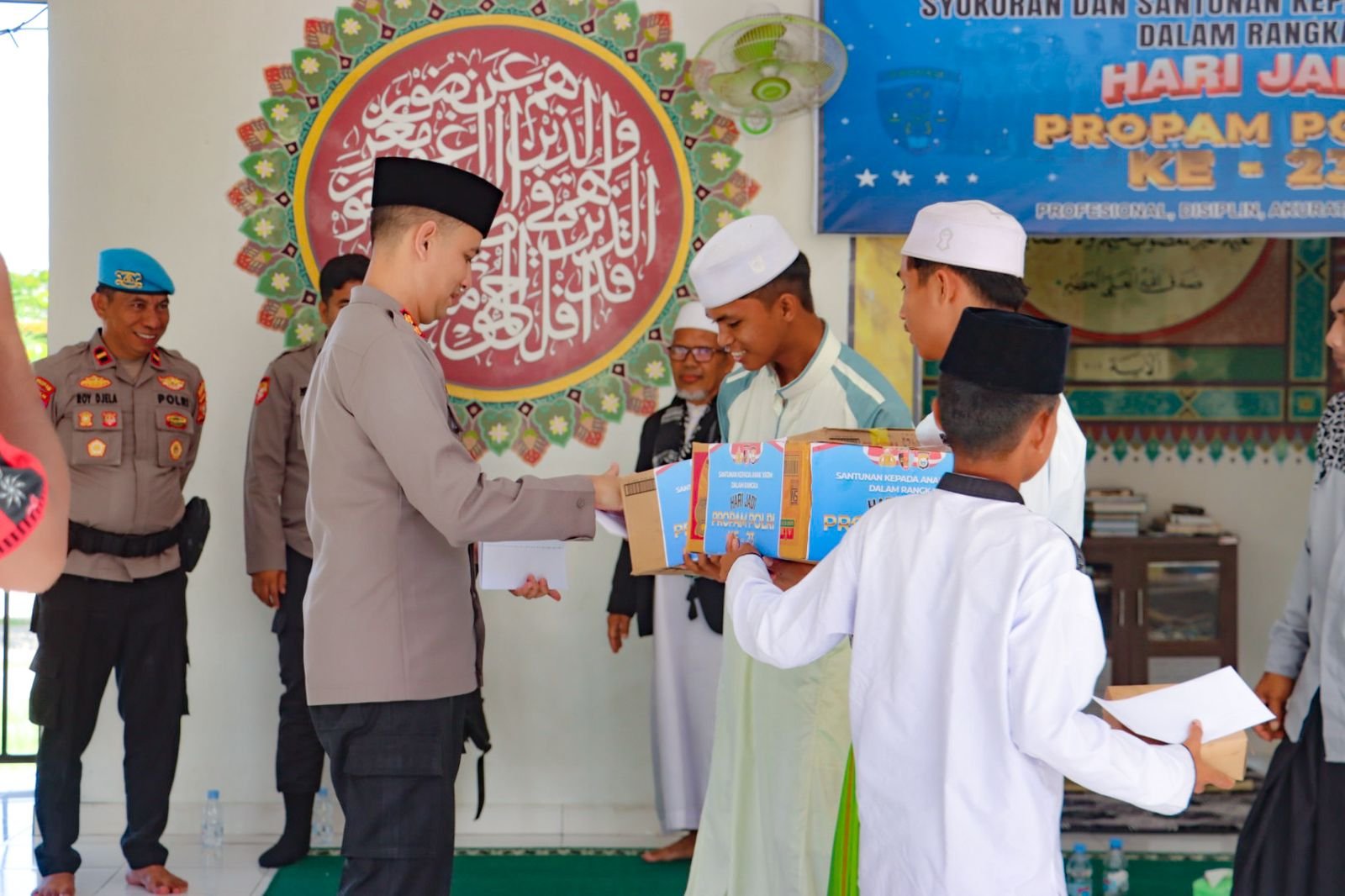 Momentum perayaan ini juga diisi dengan kegiatan sosial berupa pemberian santunan kepada anak-anak yatim dari Ponpes Al Kaafi. Penyerahan santunan dilakukan langsung oleh Kapolres Halmahera Selatan didampingi Kepala Seksi Propam Polres Halsel, Ipda Wery Roy Djela, S.H., sebagai wujud kepedulian dan rasa syukur di hari istimewa Propam Polri.