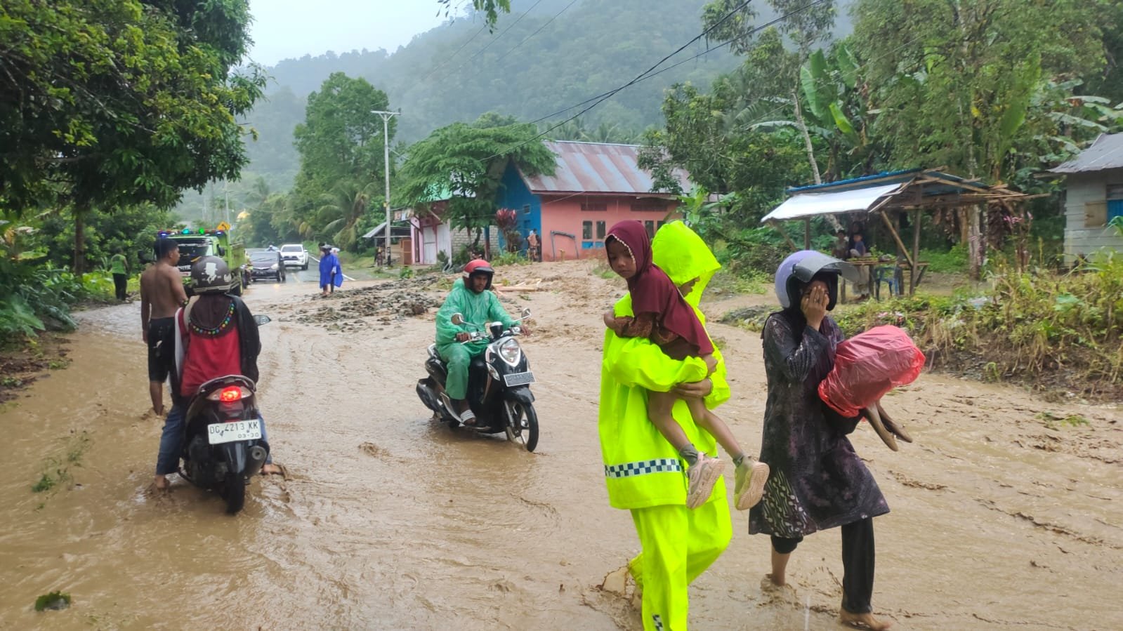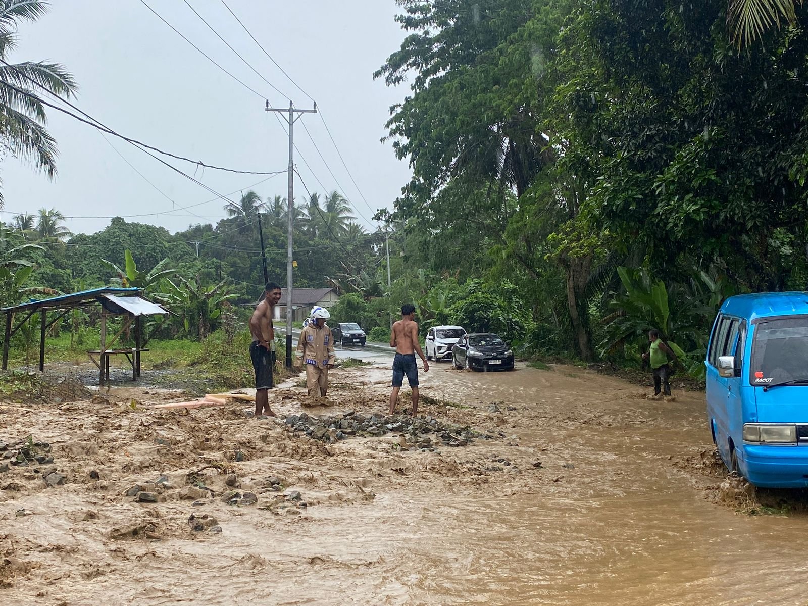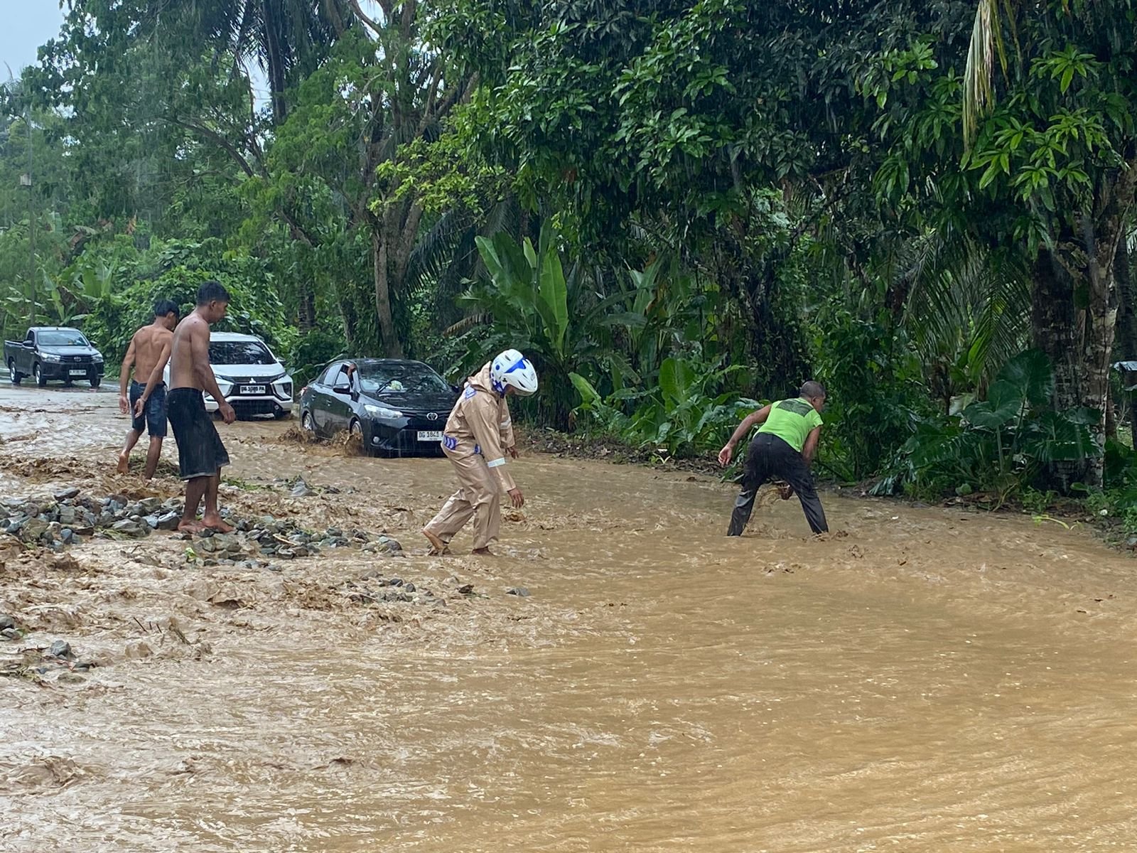 Mendapat laporan dari warga, personel Sat Lantas Polres Halsel segera turun ke lokasi untuk memberikan bantuan. Sesampainya di tempat kejadian, petugas langsung melakukan berbagai upaya, mulai dari membantu beberapa warga yang sudah berada di sekitar lokasi banjir untuk menghalau aliran air, hingga memastikan kondisi jalan tetap bisa dilalui dengan aman.
