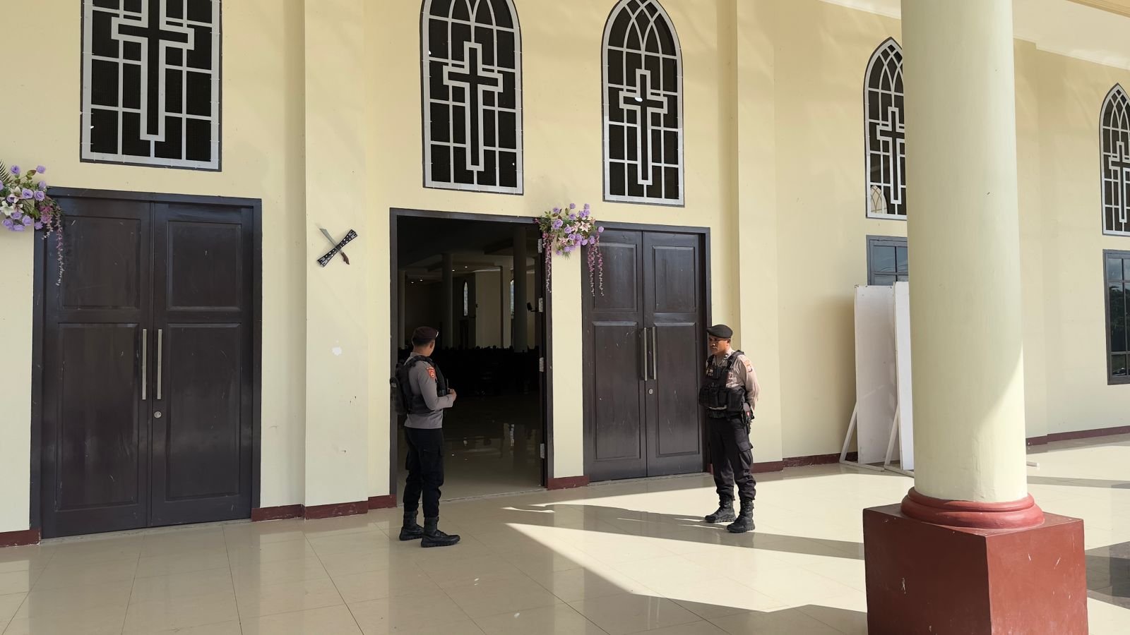 Pengamanan dilakukan secara terstruktur dengan menempatkan personel di titik-titik strategis, mulai dari pintu masuk, area parkir, hingga lingkungan sekitar gereja.
