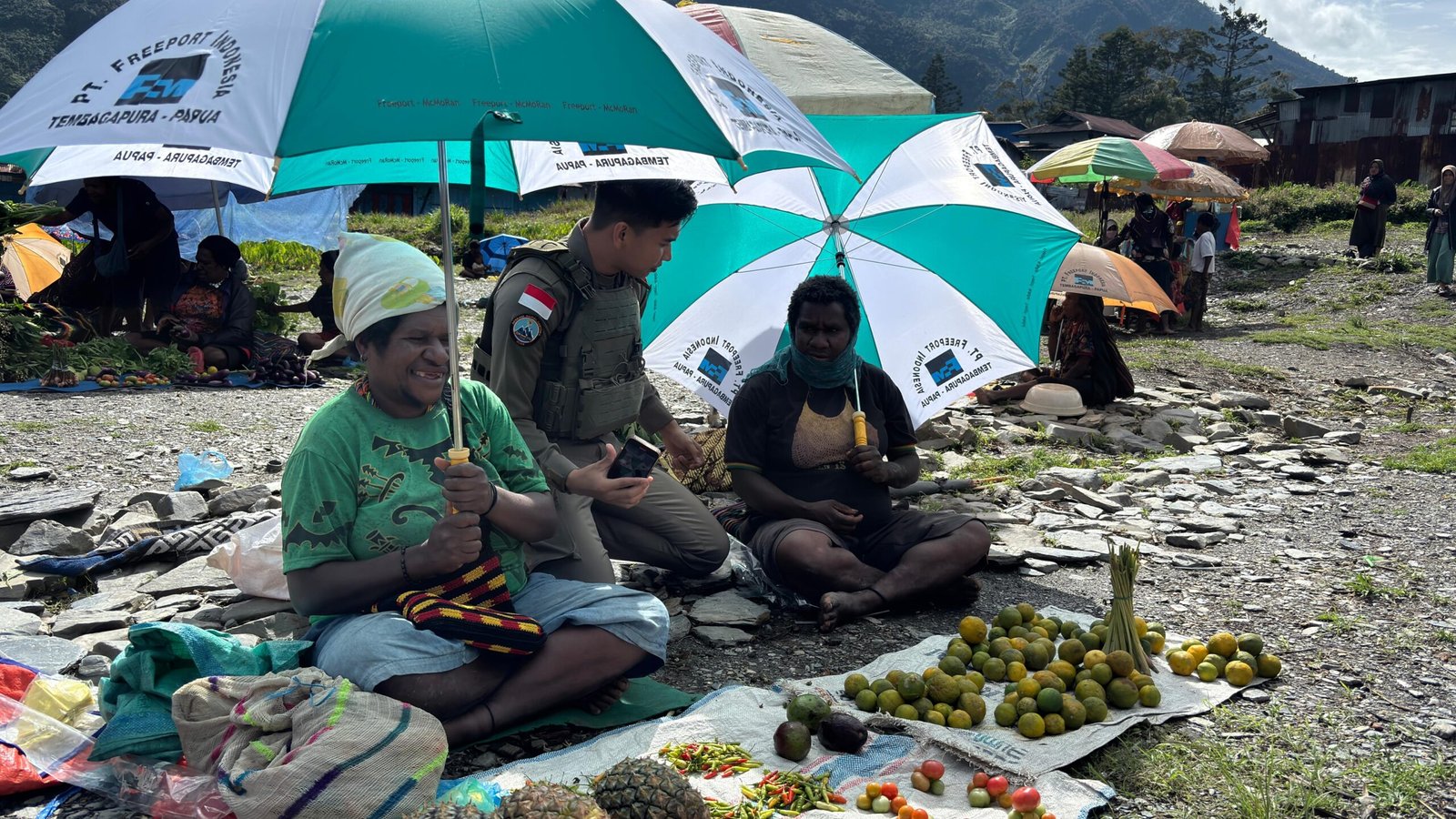 Personel Satbrimob Polda Papua, Bripda Rafly, yang tergabung dalam Operasi Damai Cartenz-2025 penugasan Puncak Jaya, turun langsung membagikan payung kepada para pedagang. Salah satu penerima bantuan tersebut adalah Lentera Wenda, seorang mama Papua yang sehari-hari berjualan di pasar.