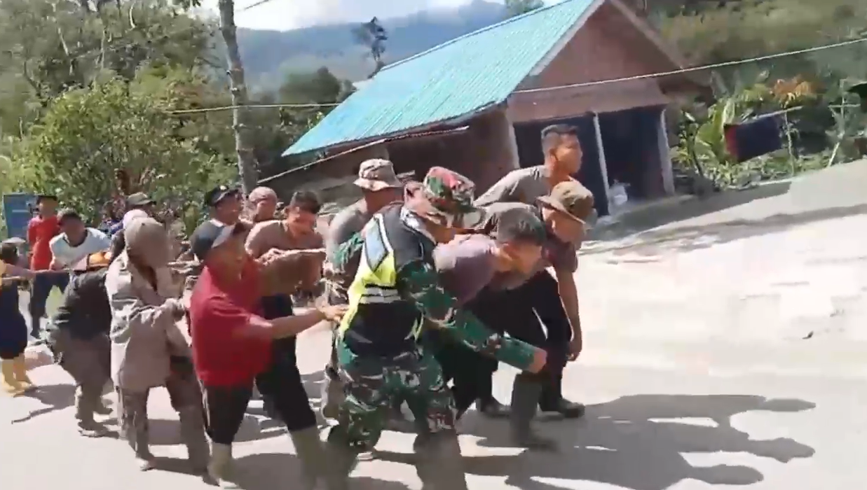 Personel Polri bersinergi dengan Babinsa serta warga setempat. Mereka bahu-membahu melangsir balok-balok kayu yang digunakan sebagai rangka dan lantai jembatan darurat, mencerminkan semangat gotong royong di tengah situasi pascabencana.