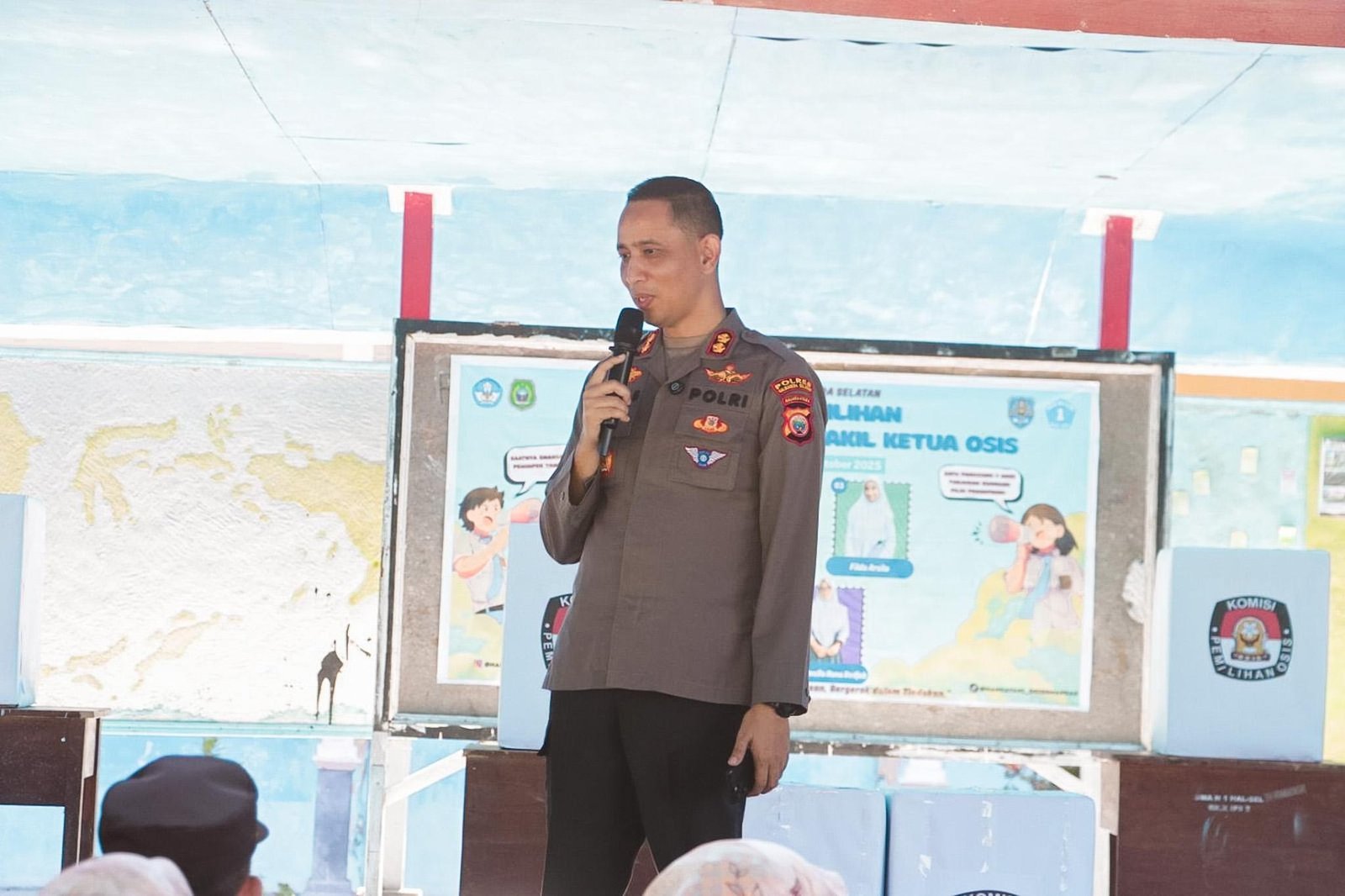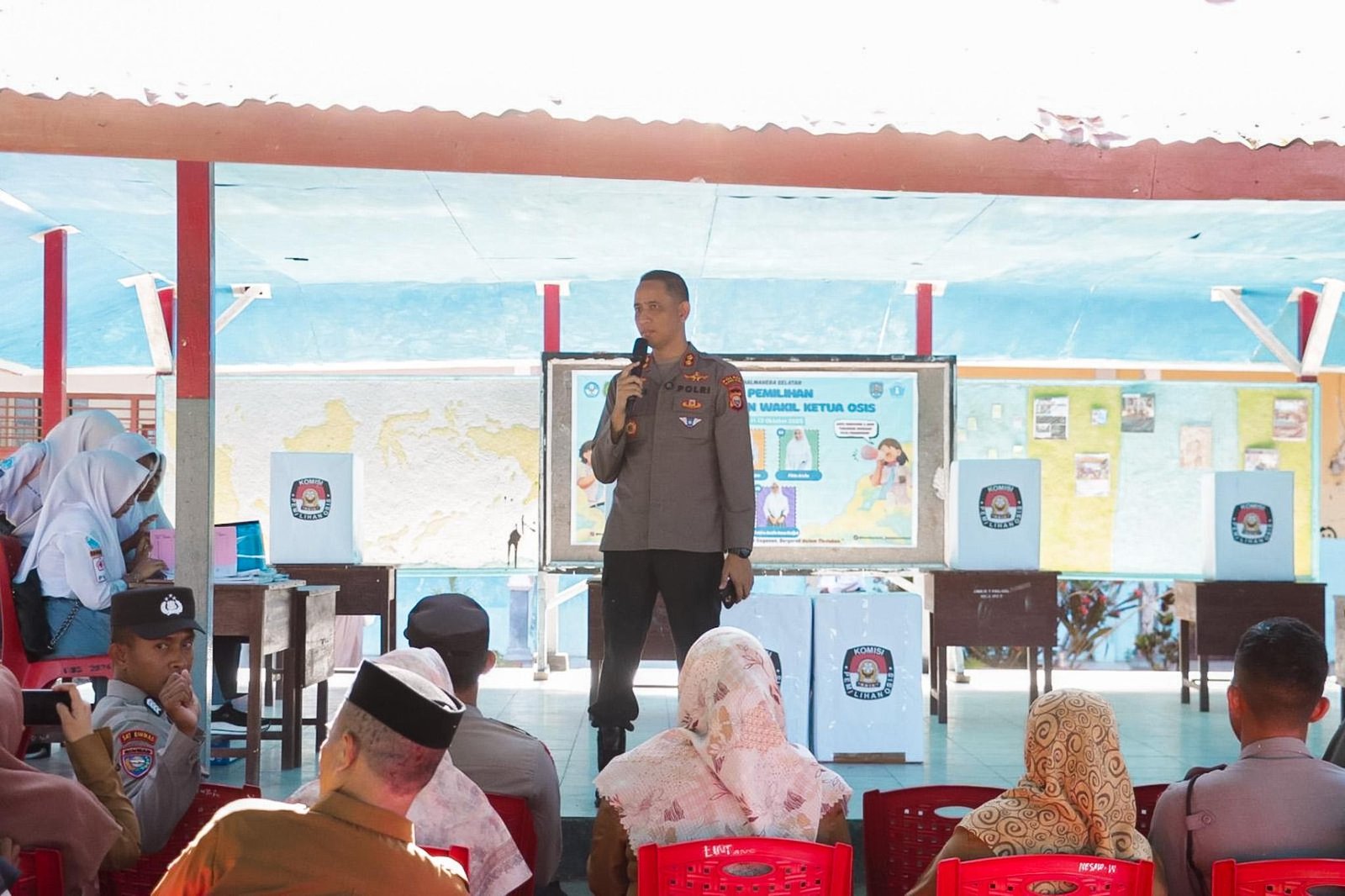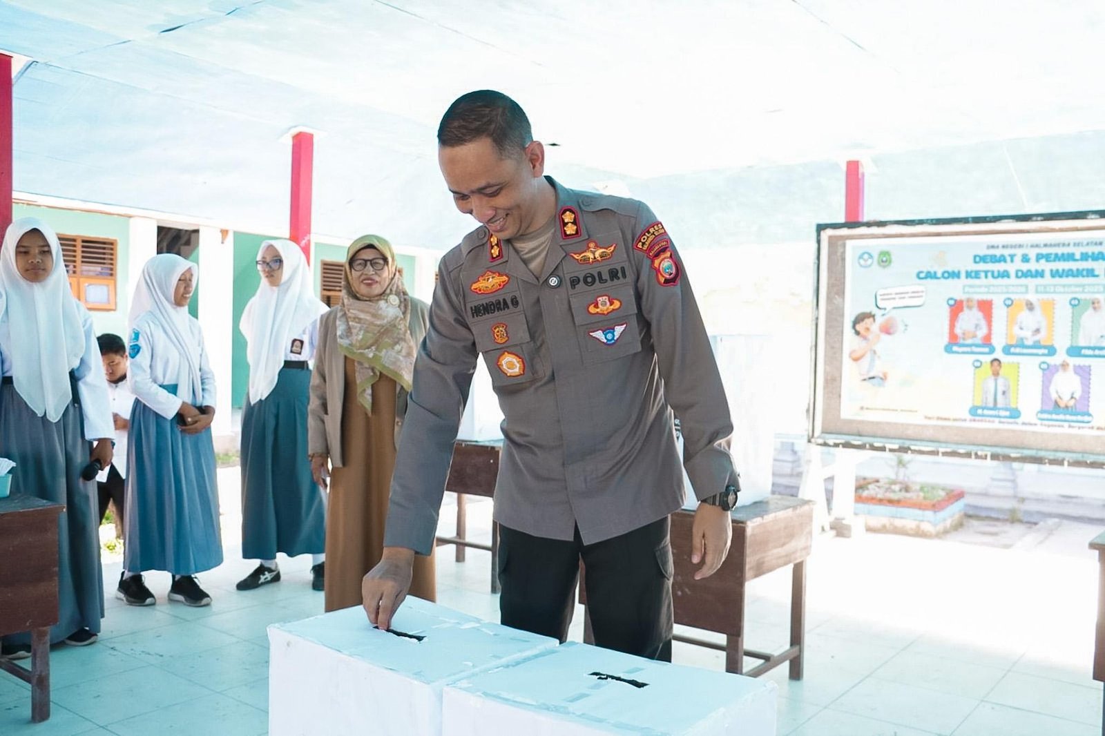 Sebagai bentuk dukungan terhadap pelaksanaan kegiatan tersebut, AKBP Hendra Gunawan juga turut memberikan suara simbolis kepada para calon Ketua OSIS usai pelaksanaan upacara bendera.